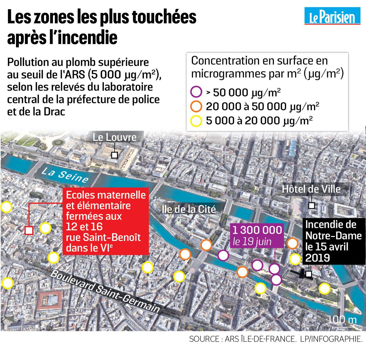 « De cada vez que há vento forte, as poeiras vão distribuir-se pelos arredores, em Paris », afirma Annie Thébaud-Mony, investigadora em sociologia da saúde que diz que já foram registados níveis elevados de poluição no jardim do Luxemburgo.A câmara de Paris rejeita a solução de cobrir a catedral.No entanto, os residentes da zona foram aconselhados a fazerem limpezas aprofundadas das suas casas e duas escolas primárias foram fechadas por precaução antes das férias.Taxas de chumbo elevadas foram registadas à volta da Notre-Dame, mas também em bairros vizinhos, bem superiores aos níveis de referência que são de 5000 microgramas/m2. Uma Associação das famílias vítimas do saturnismo, a doença causada por intoxicação por chumbo no organismo, distribuiu um comunicado aos habitantes e comerciantes mas, no geral, as pessoas dizem confiar nas autoridades.