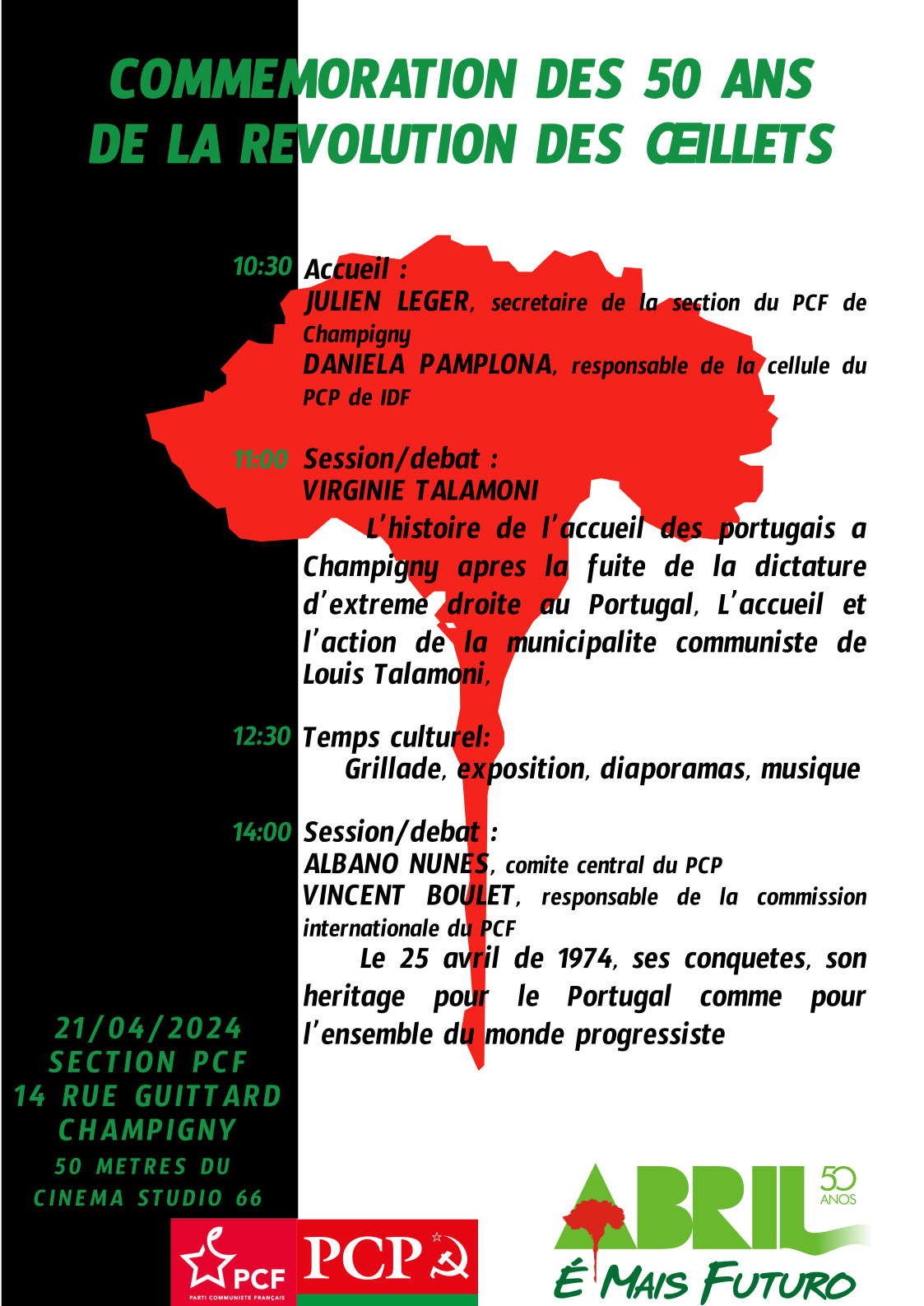 -Comemoração do 50° Aniversário do 25 de Abril 1974 em Champigny-sur-Marne, dia 21 de abril, debates, exposição, música e gastronomia, nos locais da secção do PCF, 14 rue Guittard – Champigny