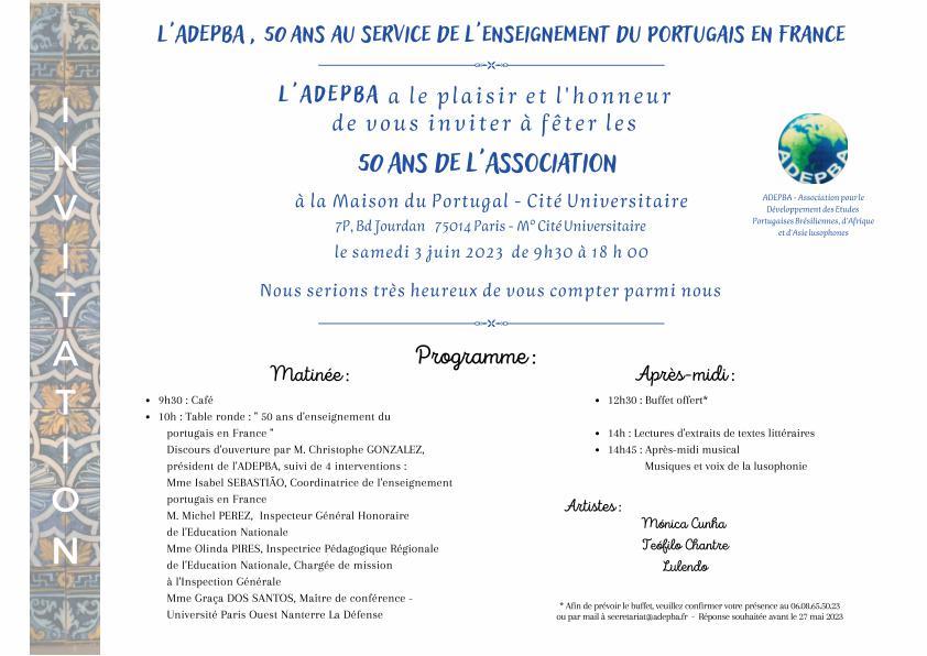 50° Aniversário da ADEPBA (Association pour le Développement des Études Portugaises Brésiliènnes, d’Afrique et d’Asie lusophones), dia 3 de junho das 9h30 às 18h00 na Maison du Portugal – Cité Universitaire. Festejar 50 anos ao serviço do ensino do Português em França, relembrar o trabalho realizado por Solange Parvaux, fundadora da associação e abordar a situação actual da Língua Portuguesa nestas terras gaulesas.