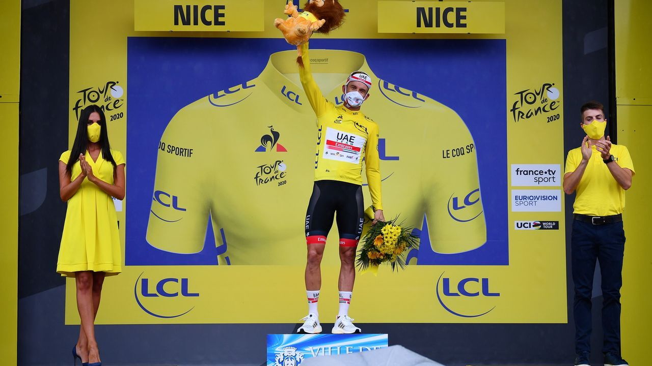 O noruegûes é o primeiro camisola amarela da história da volta à França a subir ao pódio com máscara.