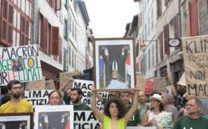 Centenas de manifestantes desfilaram neste domingo, pacificamente, em Baiona, com retratos oficiais do presidente Emmanuel Macron tirados discretamente, nos últimos dias, de edifícios municipais da região. Retratos foram exibidos no desfile com Macron em posição invertida, de cabeça para baixo. Foto: LP/Philippe de Poulpiquet
