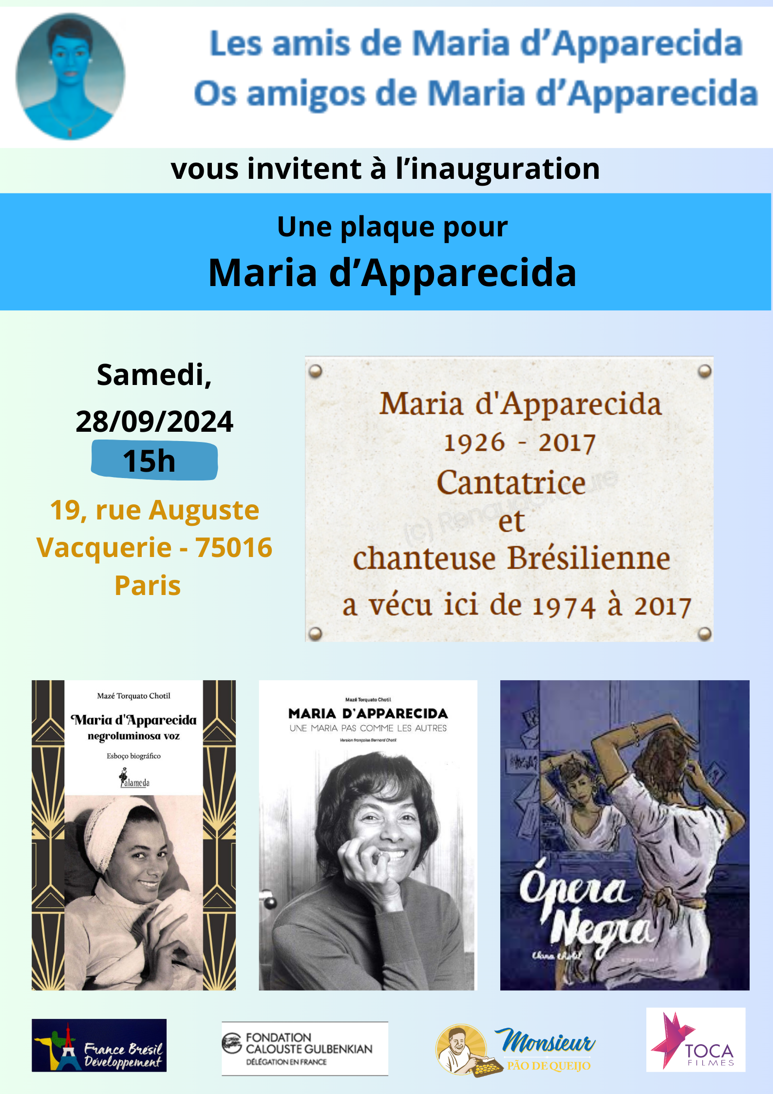No próximo dia 28, a Associação os Amigos de Maria d’Apparecida inaugura no prédio onde ela morou, a dois passos do Arco do Triunfo, em Paris, uma placa comemorativa em seu nome.