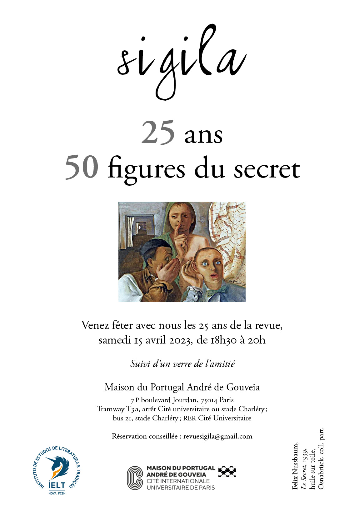 –Literatura: Os 25 anos da revista “SIGILA”, uma publicação transdisciplinar franco-portuguesa sobre o segredo, vão ser festejados no dia 15 de Abril às 18h30, na Maison du Portugal – André Gouveia, Cité internationale universitaire de Paris