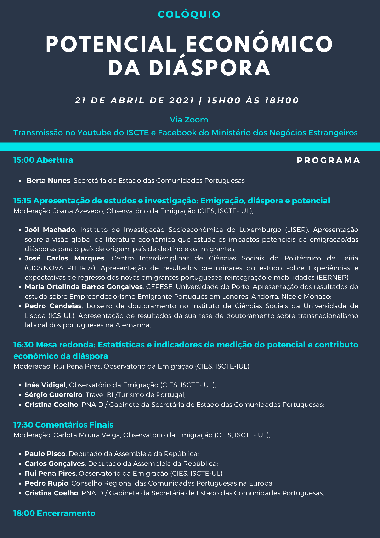 A Secretaria de Estado das Comunidades Portuguesas do Ministério dos Negócios Estrangeiros (SECP-MNE), em parceria com o Observatório da Emigração (ISCTE-IUL) e o Conselho Regional das Comunidades Portuguesas na Europa (CRCPE) organizam um Colóquio sobre o « Potencial Económico da Diáspora », que terá lugar no dia 21 de abril entre as 15h e as 18h, hora de Lisboa.