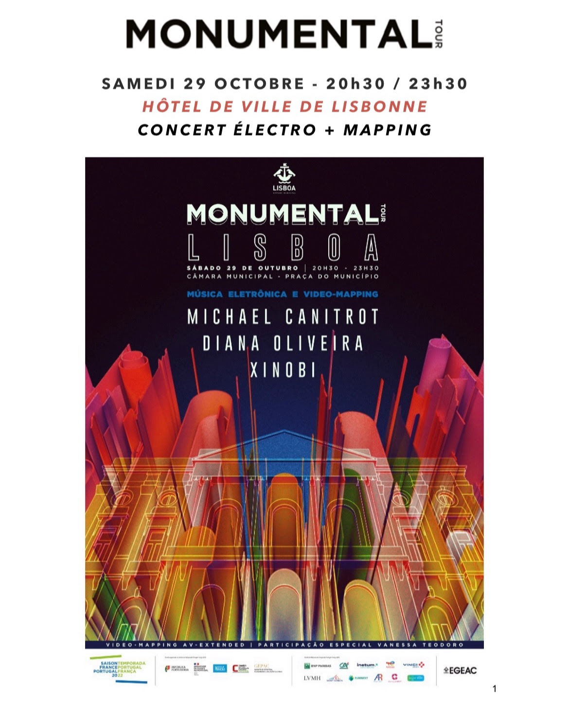 Lisboa: Praça do Município acolhe a 29/10 o Monumental Tour – concerto de electrónica, vídeo e festa animados pelos DJ Michael Canitrot (francês) e Xinobi e Diana Oliveira (ambos portugueses). Também a artista visual portuguesa Vanessa Teodoro apresentará algumas das suas criações.