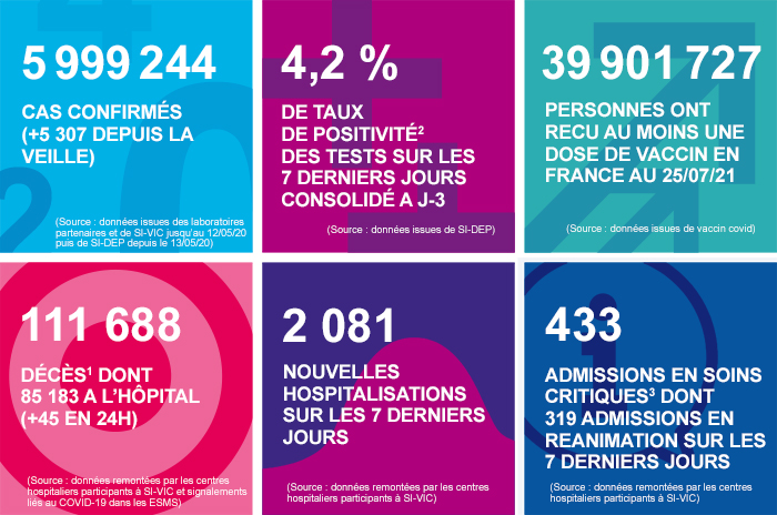 Les chiffres clés en France au 26/07/2021, arrêtés à 14h (mis en ligne en fin de journée)