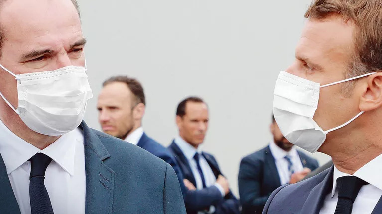 Emmanuel Macron e o seu novo chefe de Governo, Jean Castex, durante a cerimónia do 14 de julho, ontem, na praça da Concórdia, em Paris.