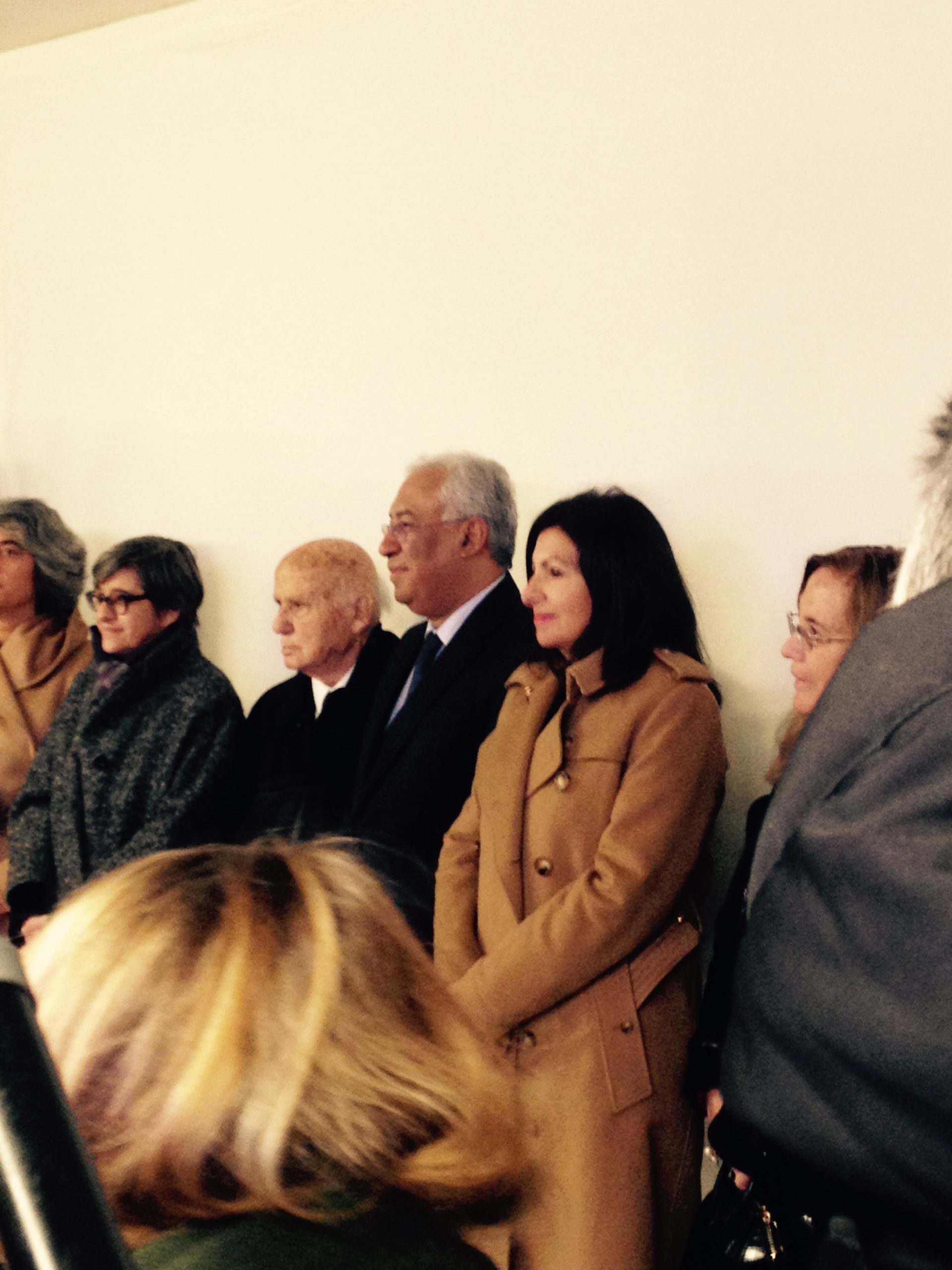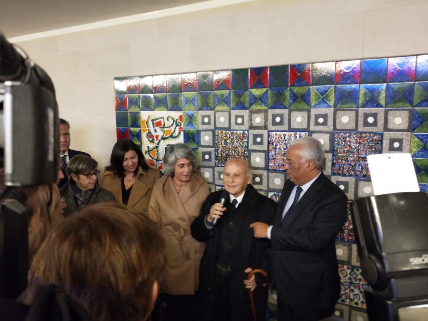 Imagem do momento da inauguração oficial dos novos azulejos de Cargaleiro na estação, antes de ser revelado o novo painel de azulejos do mestree. Anne Hidalgo com António Costa e o artista: