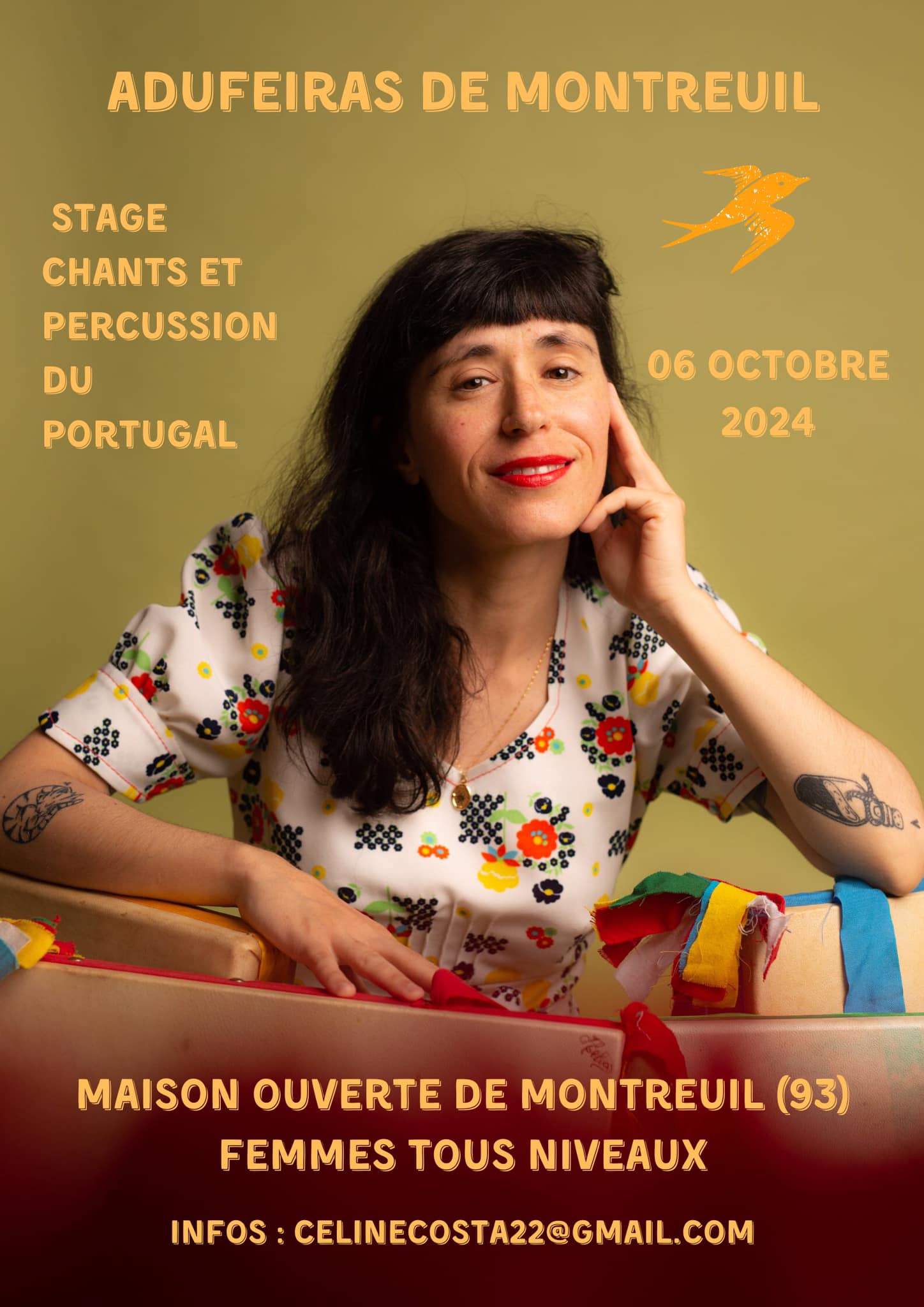 -Estão abertas as inscrições para participar no Estágio de canto e de percussões de Portugal (ADUFE), que se realiza dia 6 de outubro, na Maison Ouverte de Montreuil (93). Uma iniciativa de Céline Costa, cantora e instrumentista de adufe e co-autora do livro “Voici mon coeur, brise- le avec un marteau”, éditions du commun, uma tradução de textos inéditos em França, oriundos de um repertório musical e poético popular.