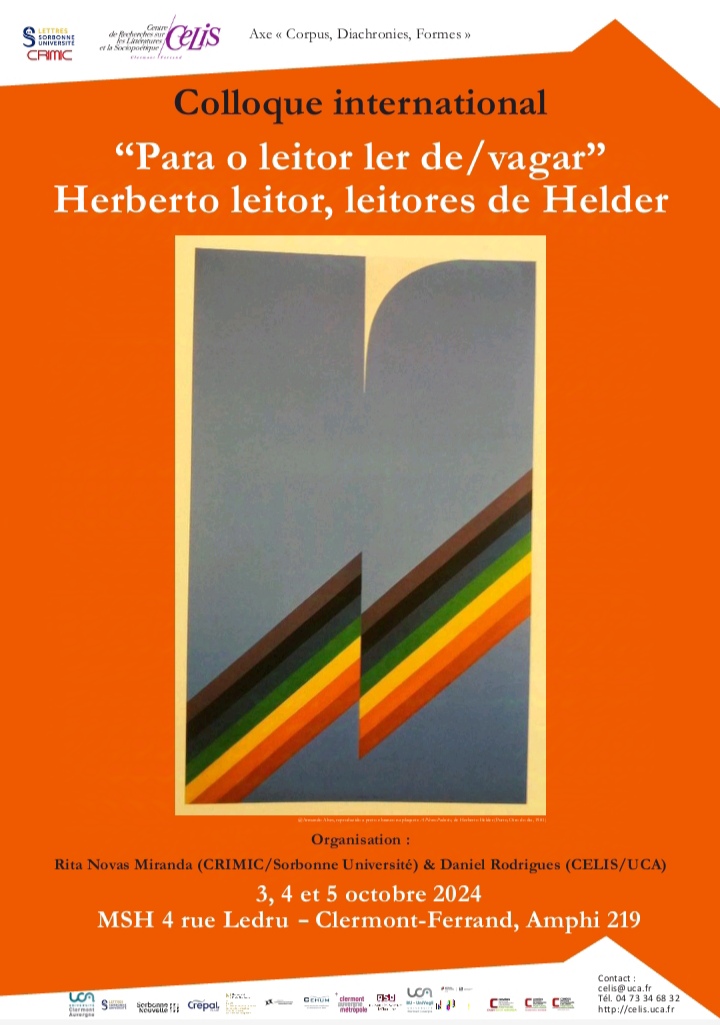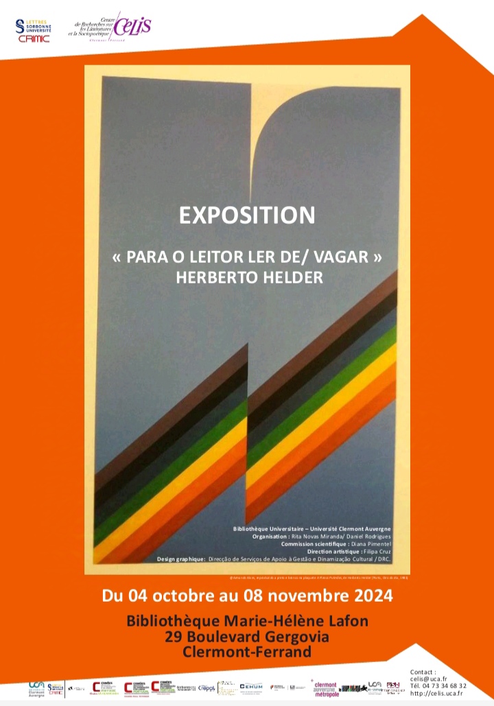 –Colóquio internacional “Para o leitor ler de/vagar” – Herberto leitor, leitores de Helder, de 3 a 5 de outubro 2024 na MSH – Clermont-Ferrand e paralelamente uma exposição alusiva ao poeta Herberto Helder, que estará patente ao público de 4 outubro ao dia 8 de novembro, na Bibliothèque Marie-Hélène Lafon, 29 Boulevard Gergovia, Clermont-Ferrand