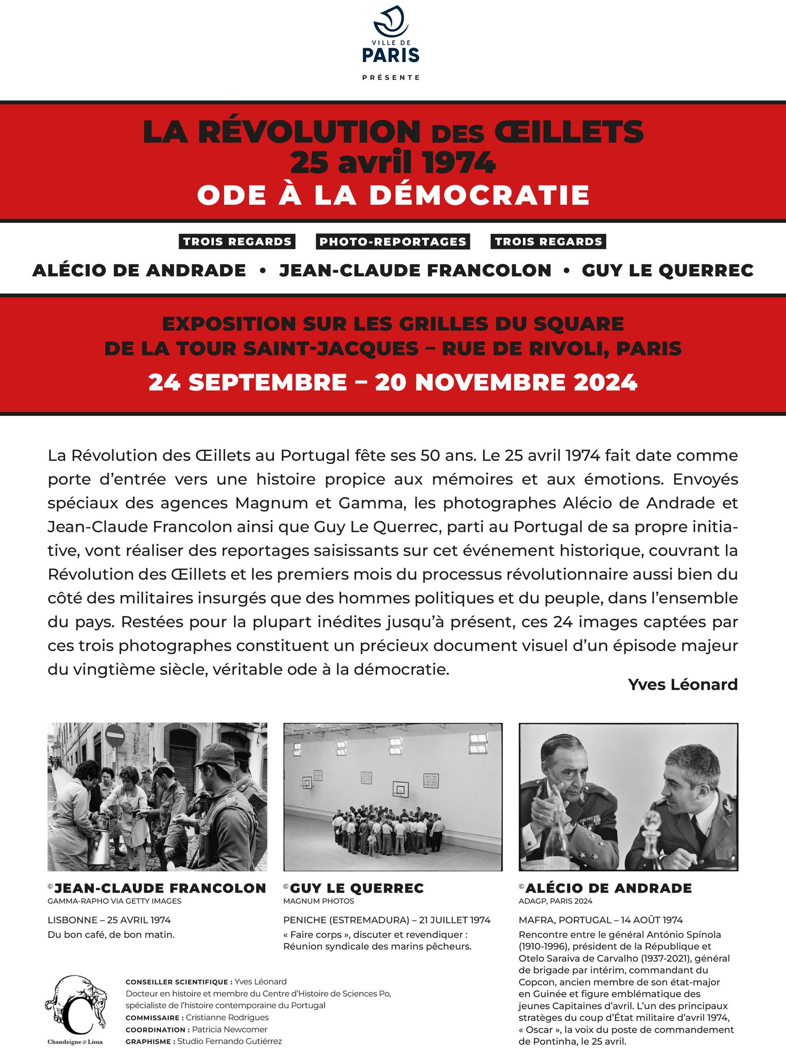 –Exposição de fotografias “Ode à la Démocratie, La Révolution, 25 avril 1974” sur les grilles du square de la Tour Saint-Jacques – Rue Rivoli, Paris, de 24 setembro a 20 de novembro 2024, com fotografias de Alécio de Andrade, Jean-Claude Francolon e Guy Le Querrec