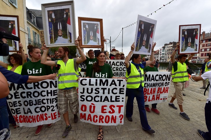 Centenas de manifestantes desfilaram neste domingo, pacificamente, em Baiona, com retratos oficiais do presidente Emmanuel Macron tirados discretamente, nos últimos dias, de edifícios municipais da região. Retratos foram exibidos no desfile com Macron em posição invertida, de cabeça para baixo.