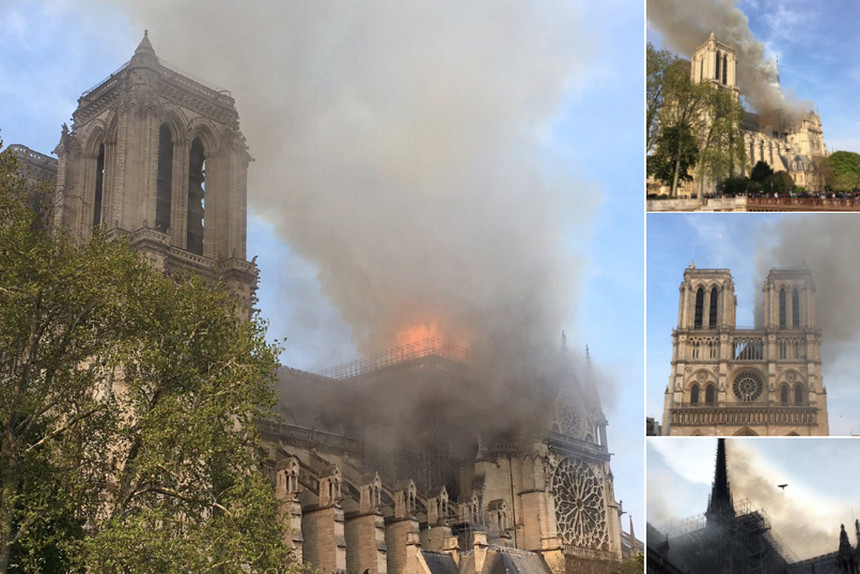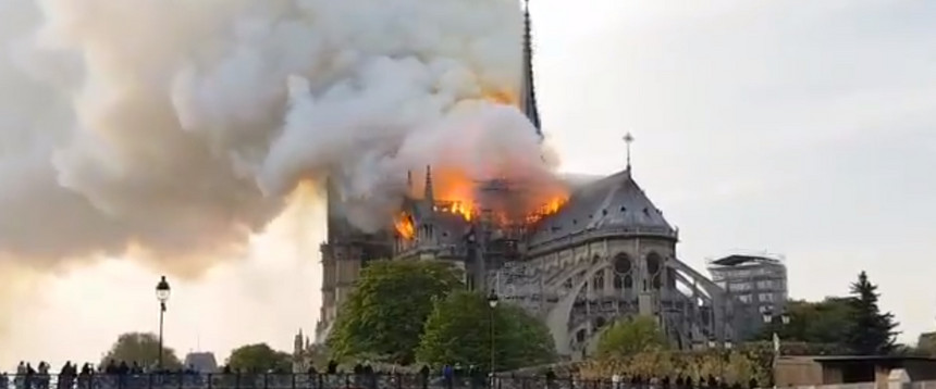 O incêndio continuava às 19h28 locais. Foi declarado pouco mais de meia hora antes. E era violento. Primeias fotos do grave incêndio. A Catedral estava em obras. Desconhecem-se as causas do incêndio. Devido ao incêndio, Presidente Emmanuel Macron adia comunicação ao país, prevista para as 20 horas, sobre a crise dos « coletes amarelos ». Às 20 horas locais o incêndio continuava, gravíssimo, e os bombeiros não conseguiam intervir. « Catástrofe, a esta hora (20h21 locais), não sabemos onde vai parar o fogo », diz Hermano Sanches Ruivo, autarca em Paris. Às 20h30, bombeiros no interior da Catedral para tentar salvar obras de arte. Às 21h09 locais, mensagem do PR português: