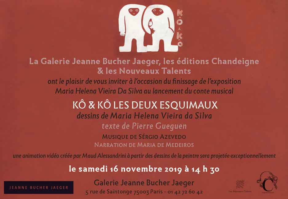 -Conto musical “KÔ & KÔ Les deux esquimaux”, com desenhos de Vieira da Silva e textos de Pierre Gueguen (de 1933) foi reeditado pelas edições Chandeigne. Apresentação dia 16 de Novembro, na Galerie Jeanne Bucher Jaeger, em Paris, com a presença, entre outros, de Maria de Medeiros – que vai ler os textos.