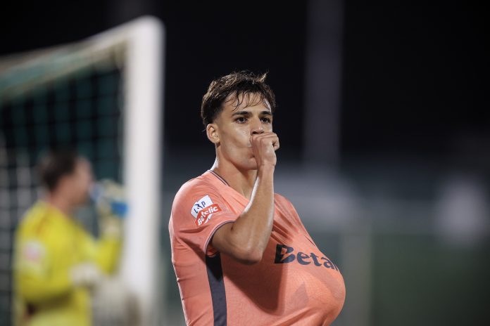 FC Porto player Gabri Veiga celebrates after scoring the 0-3 goal against Rio Ave during the Portuguese First League soccer match at Arcos stadium, in Vila do Conde, Portugal, 19 September 2025. JOSE COELHO/LUSA