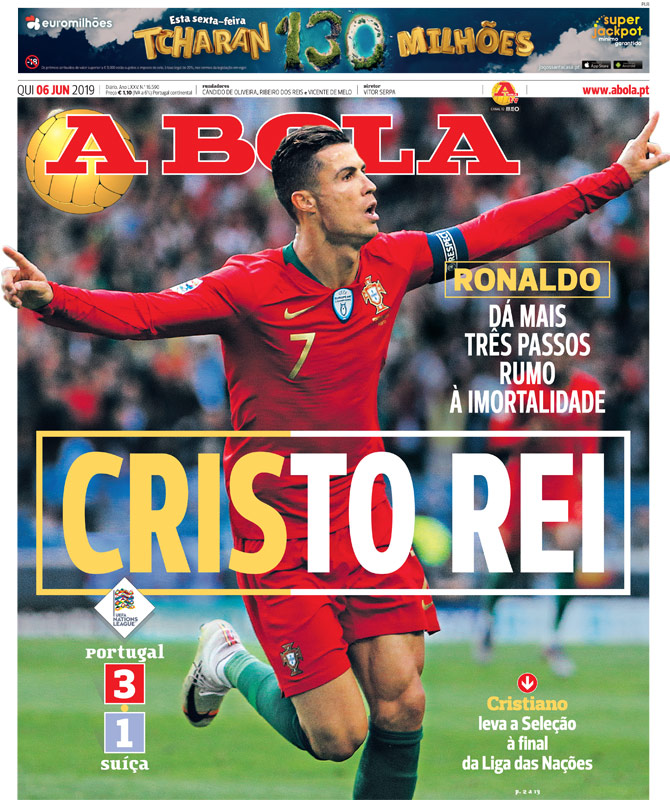 Em Portugal, hoje, quinta-feira, é só elogios a CR7. Um exemplo, a capa de A Bola: