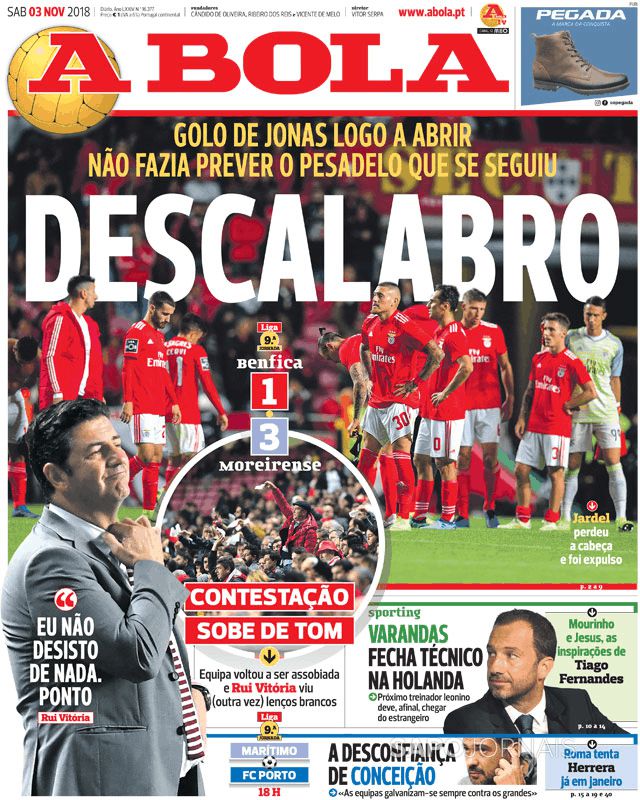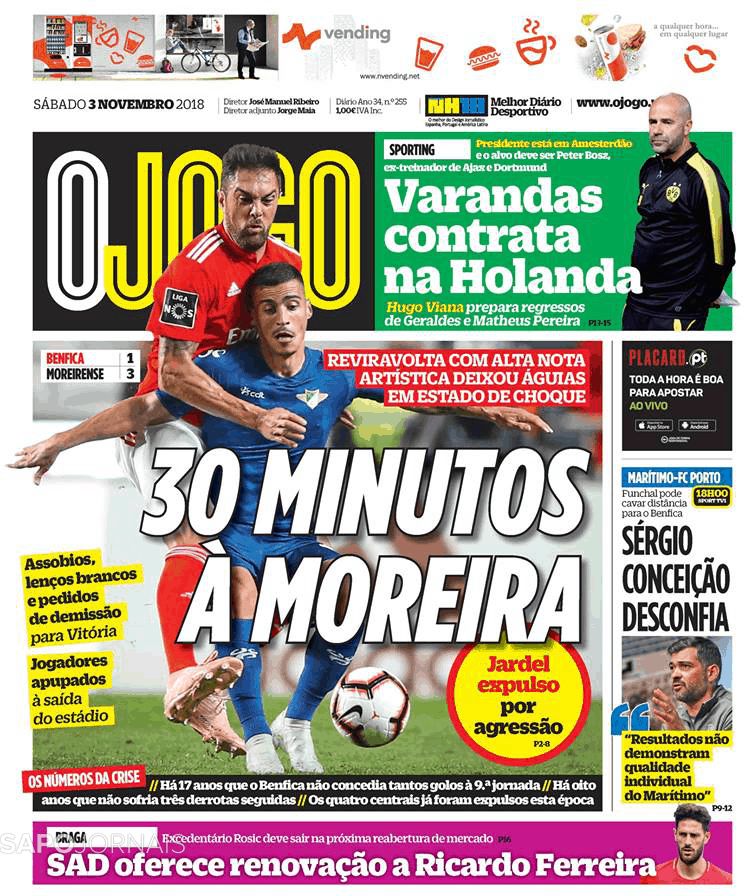 « ESCÂNDALO NA LUZ. MOREIRENSE VENCE BENFICA POR 3-1 E DEIXA RUI VITÓRIA EM ‘MAUS LENÇÓIS' » – título de Sapo.pt.