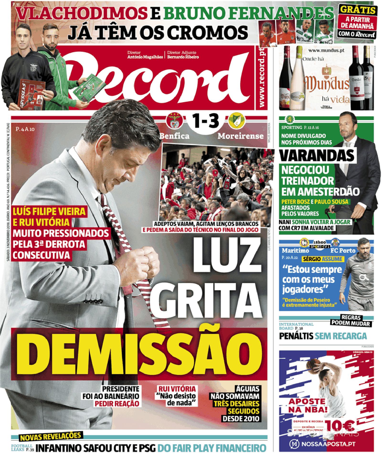 Depois da derrota do Benfica, os jornais desportivos fazem capas sobre o assunto e informam sobre « lenços brancos » na Luz. « Luz grita DEMISSÃO », escreve o Record. Veja as capas dos três principais jornais desportivos:
