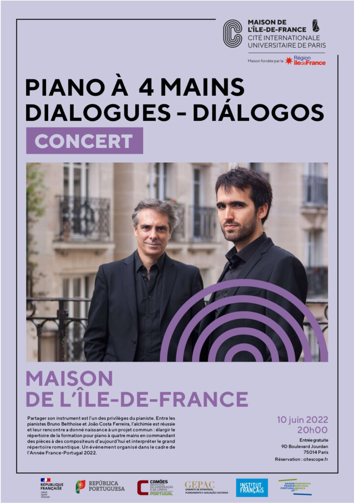 Música: -No dia 10 de Junho, dia de Portugal e das Comunidades Portuguesas, e no âmbito da Temporada France/Portugal 2022, vai ter lugar um concerto de piano a quatro mãos, com João Costa Ferreira e Bruno Belthoise, às 20h00 na Maison de l’île-de-France – Cité Internationale Universitaire de Paris