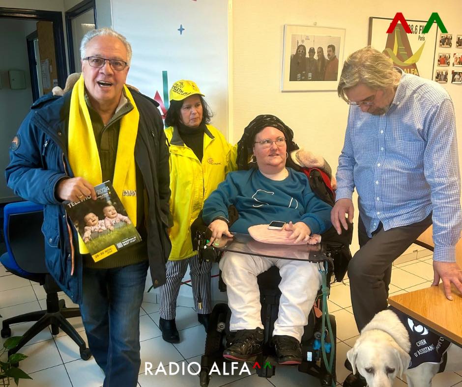 Passagem de Nível de 24 novembro 2024 – em estúdio Amália Rafrafi, Coordenadora no Val-de-Marne, Tony Gama, Padrinho do evento no Dep. 94 e Maya Allouch — doente « Amyotrophie spinal de type2 » – Téléthon 2024 (29 e 30 de Novembro). Foto. Manuel Alexandre