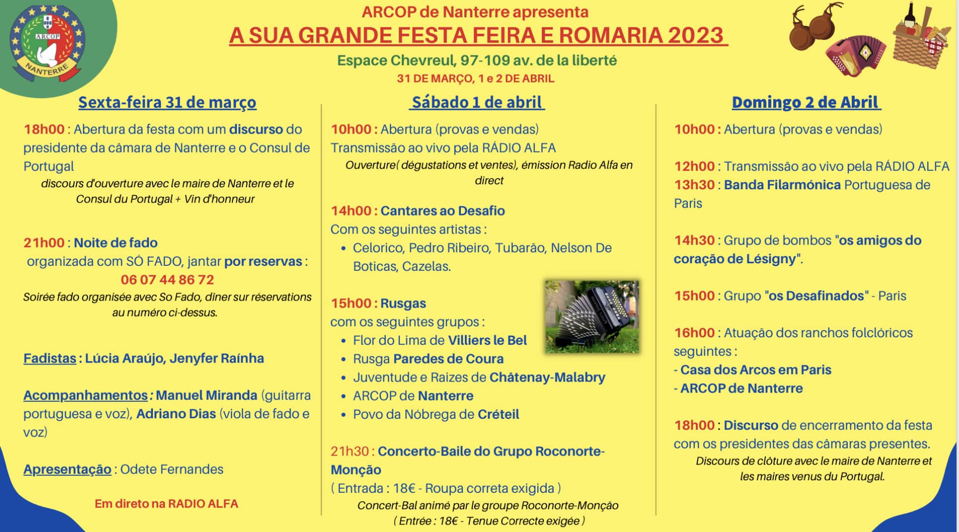 Emissão em directo a partir da 18ª Edição do salão do artesanato e dos produtos regionais portugueses, dias 31 de Março, 1 e 2 de Abril, no Espace Chevreul, 97-109 Av. de la Liberté, em Nanterre, organizado pela ARCOP-Nanterre, com a presença de delegações de 19 municípios.
