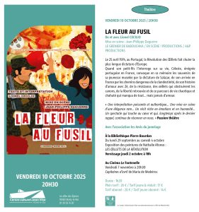 -Teatro : A peça “La fleur au fusil”, do autor e actor Lionel Cecilio, vai ser representada no Centre culturel Jean Vilar de Marly-le-Roi, na sexta-feira dia 10 de outubro às 20h30.