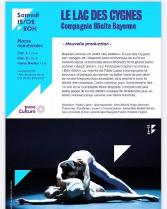 -Para festejar os 10 anos de existência a Compagnie Illicite Bayonne – Fábio Lopez Bayonne apresenta uma nova criação do famoso ballet “Le Lac des Cygnes”, dia 15 de fevereiro às 20h00, na Salle Lauga, em Bayonne (64)