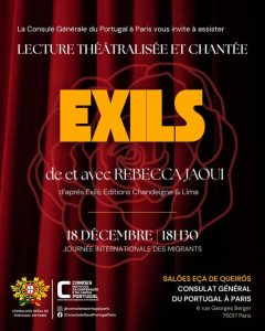 Lecture théâtralisée et chantée, de et par Rebecca Jaoui, d’après EXILS, Editions Chandeigne & Lima, le 18 décembre à 18h30 au Consulado-Geral de Portugal em Paris , 6 rue Georges Berger – 75017 Paris.
