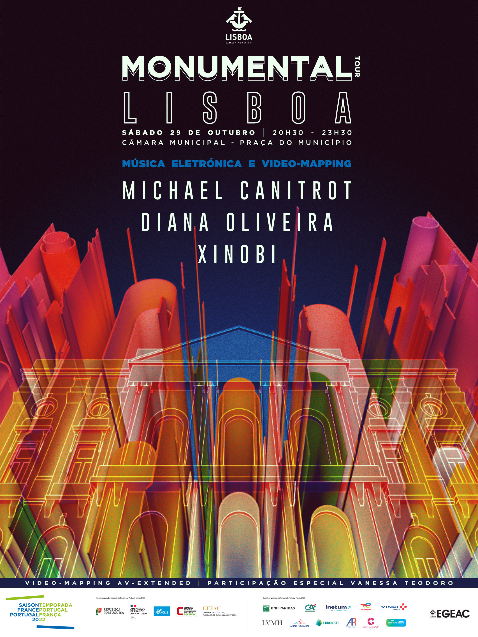 Às 20h30 locais, a Praça do Município de Lisboa será palco do Monumental Tour, uma festa de música eletrónica com ‘videomapping’, que estabelece um diálogo entre o património e as novas tecnologias, proporcionando a redescoberta dos monumentos através de enormes cenografias.