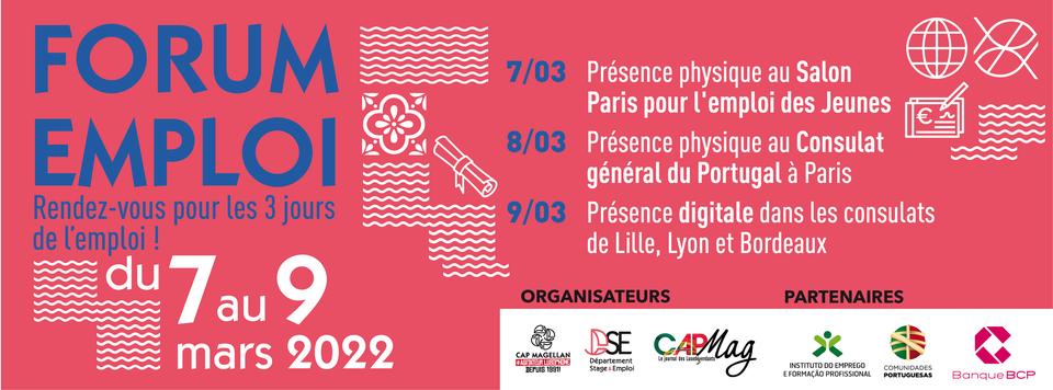 Forum pour l’emploi de 7 a 9 de Março, em presencial no Salon Paris pour l’emploi des jeunes, no Consulado de Portugal em Paris e em digital em vários Consulados