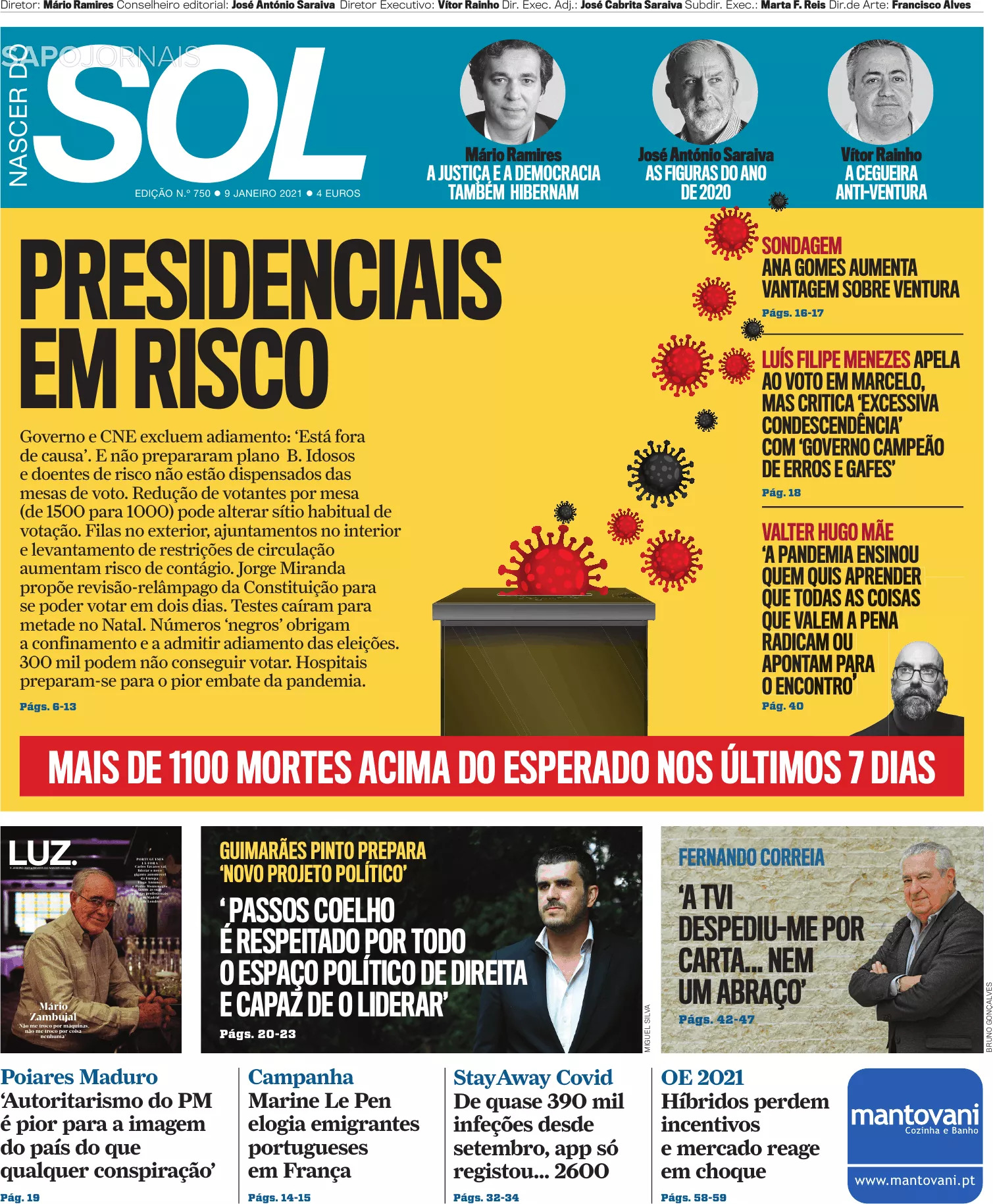 Entretanto, reagindo à gravidade da crise sanitária no país, Rui Rio, líder do PSD, evocou a possibilidade do adiamento das presidenciais marcadas para 24 de janeiro. Mas essa eventualidade coloca problemas constitucionais – seria necessária uma revisão-relâmpago da Constituição que, em princípio, nem sequer pode ser revista quando o país se encontra em estado de emergência, como é o caso neste momento.