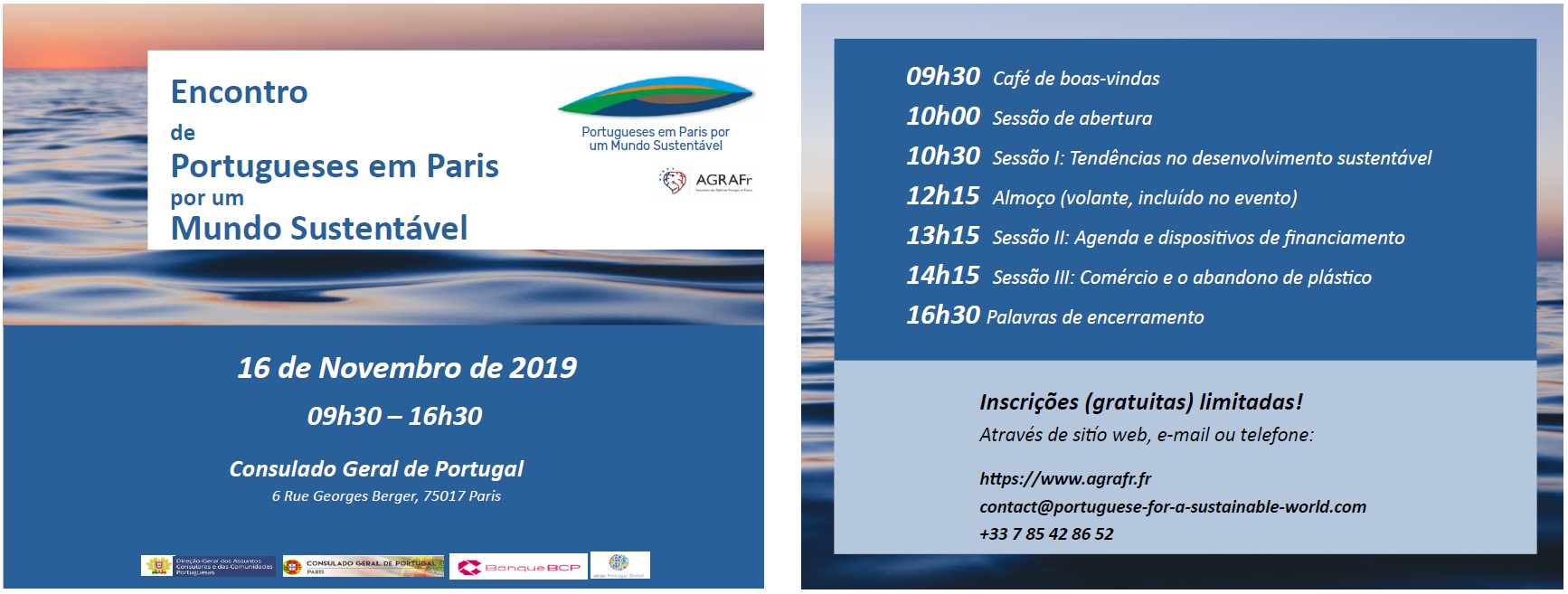 A AGRAFr, Associação de Graduados Portugueses em França, organiza o 1º Encontro de Portugueses em Paris por um Mundo Sustentável (PPMS), que terá lugar no dia 16 de Novembro de 2019, no Consulado-Geral de Portugal em Paris.