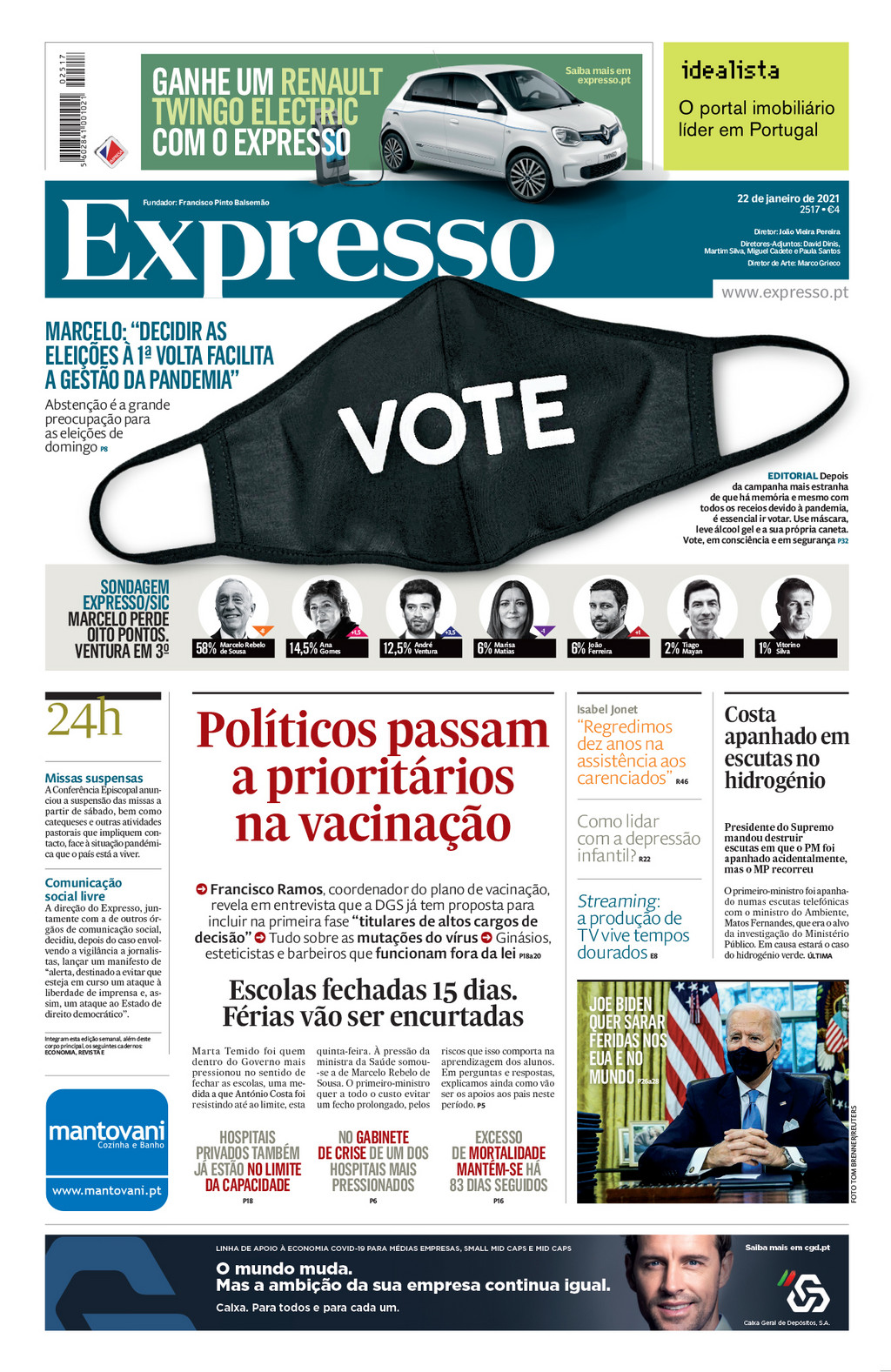Acrescenta o jornal que « de dezembro até agora, Marcelo Rebelo de Sousa perde oito pontos na última sondagem realizada pelo ISCTE/ICS para o Expresso e a SIC: passa de 66% para 58%. A vantagem é muito grande para a dupla que disputa o segundo lugar — mas essa confirma-se ser uma disputa taco a taco —: Ana Gomes sobe, mas marginalmente, dos 13% para os 14,5%, enquanto André Ventura atinge os 12,5% das intenções de voto, mais 3,5 pontos percentuais do que tinha há um mês. A diferença entre os dois é agora de dois pontos, dentro da margem de erro da sondagem (que é de 3%). »