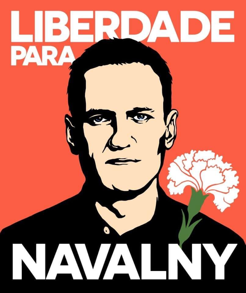 O presidente russo, Putin, e o cravo do 25 de abril português do opositor Navalny, que continua preso.
