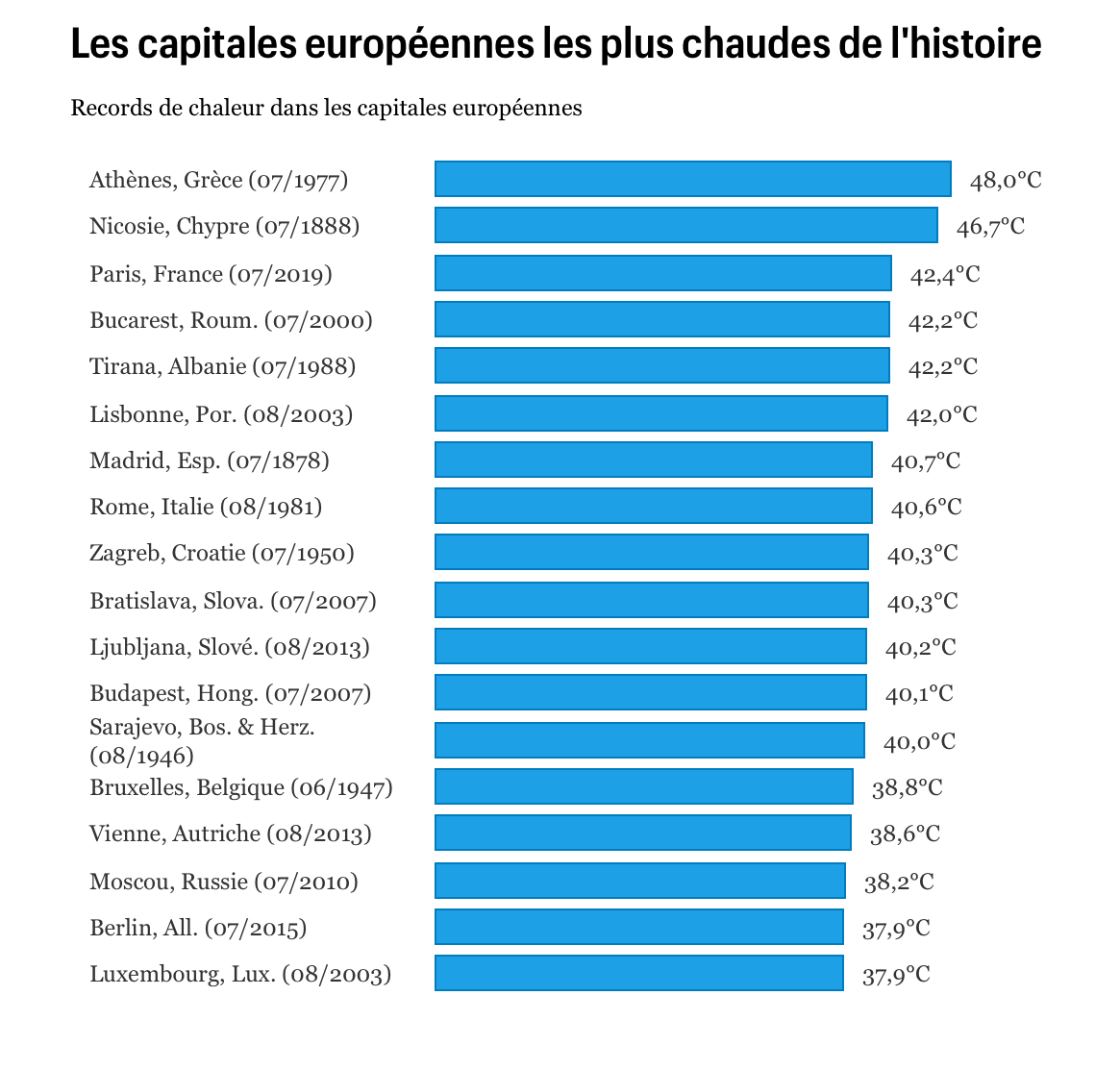 Clique na imagem do gráfico e confira quais são agora as capitais europeias mais quentes da história. Paris está agora em 3º, Lisboa em 6º e Madrid em 7º.