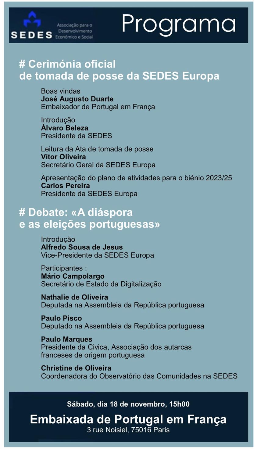 Terá lugar na Embaixada de Portugal em França, no próximo sábado dia 18 de novembro, às 15 horas, a cerimónia de tomada de posse da SEDES Europa – Associação para o Desenvolvimento Económico e Social.