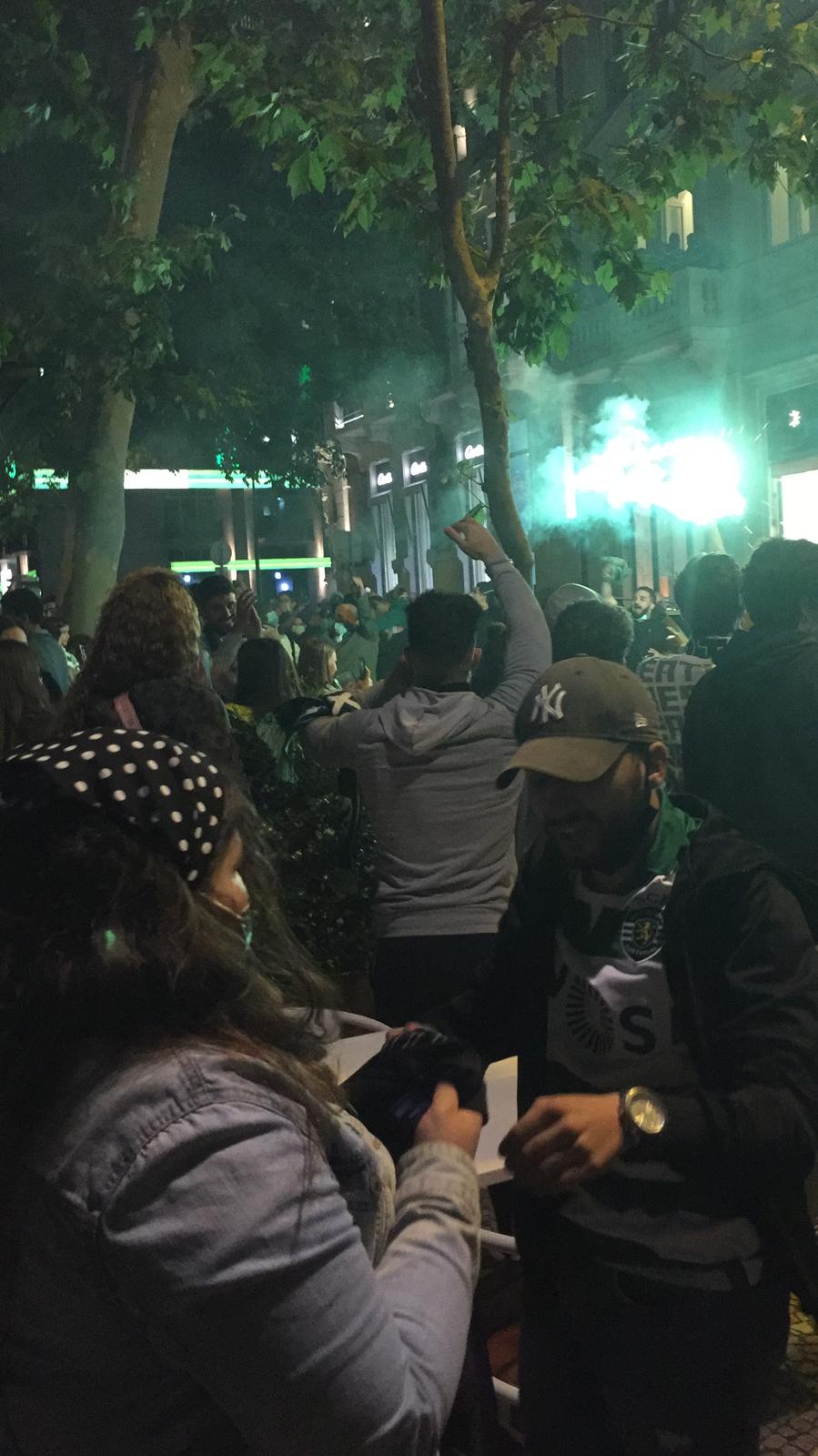 Desde o apito final em Alvalade, uma vasta multidão acorreu ao Marquês de Pombal, que tinha a estátua iluminada de verde, em clima de enorme festa e com engenhos pirotécnicos em largo número, como fogo de artifício, tochas ou petardos, mas sem cumprirem qualquer tipo de distanciamento social e muitos até sem utilizar máscara.