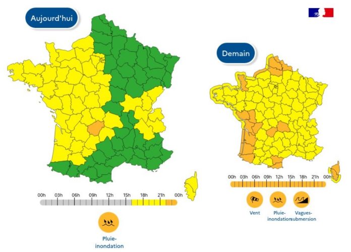 Os départements do ‘Nord, Pas-de-Calais, Somme, Manche, Vendée, Deux-Sèvres, Charente-Maritime, Charente, Pyrénées-Orientales, Haute-Corse, Corse-du-Sud, l’Aude e Puy-de-Dôme estão em alerta laranja por “vento” a partir da meia-noite de quinta-feira.
