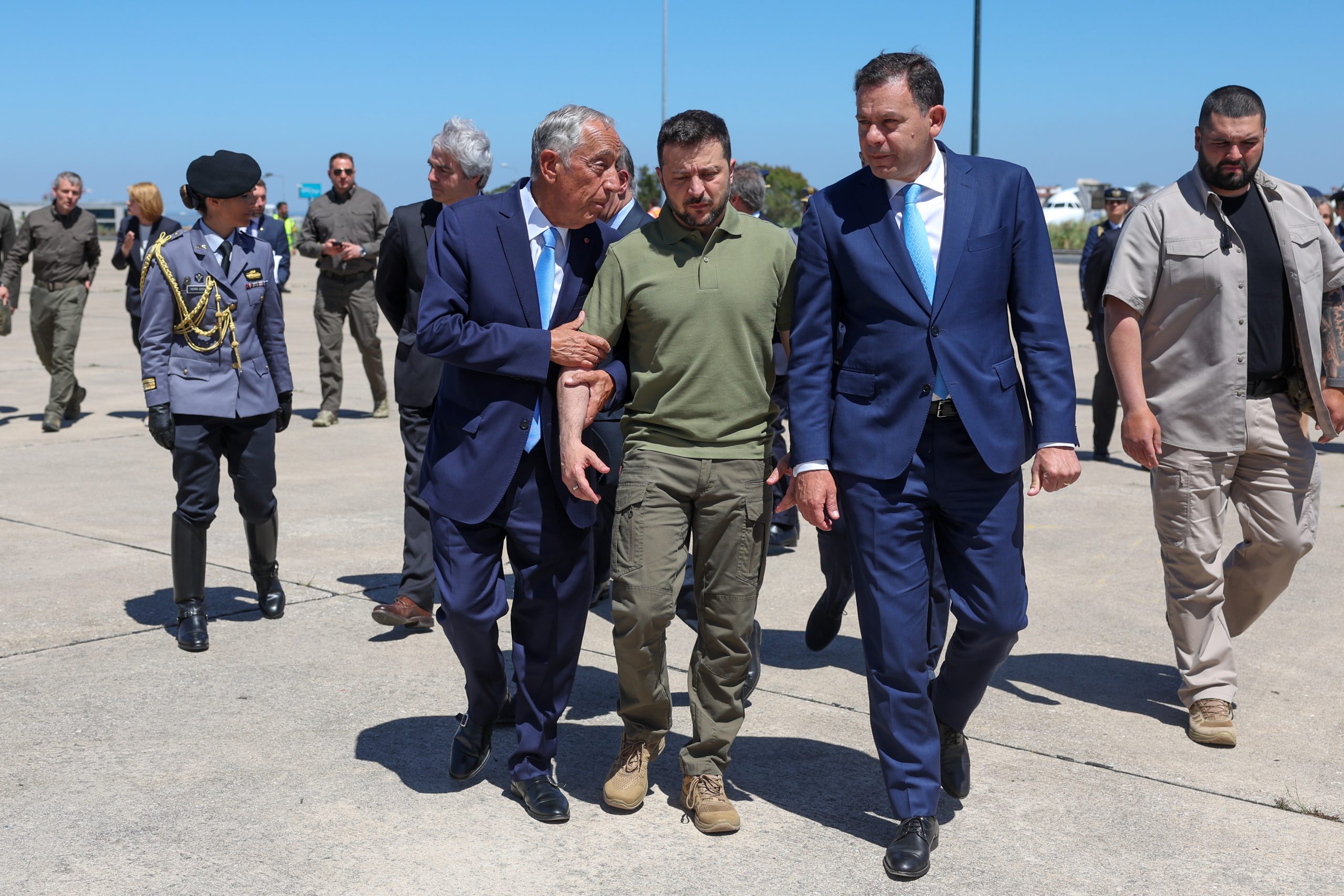 Zelensky foi recebido no aeroporto pelo Presidente da República, Marcelo Rebelo de Sousa, e pelo primeiro-ministro, Luís Montenegro.