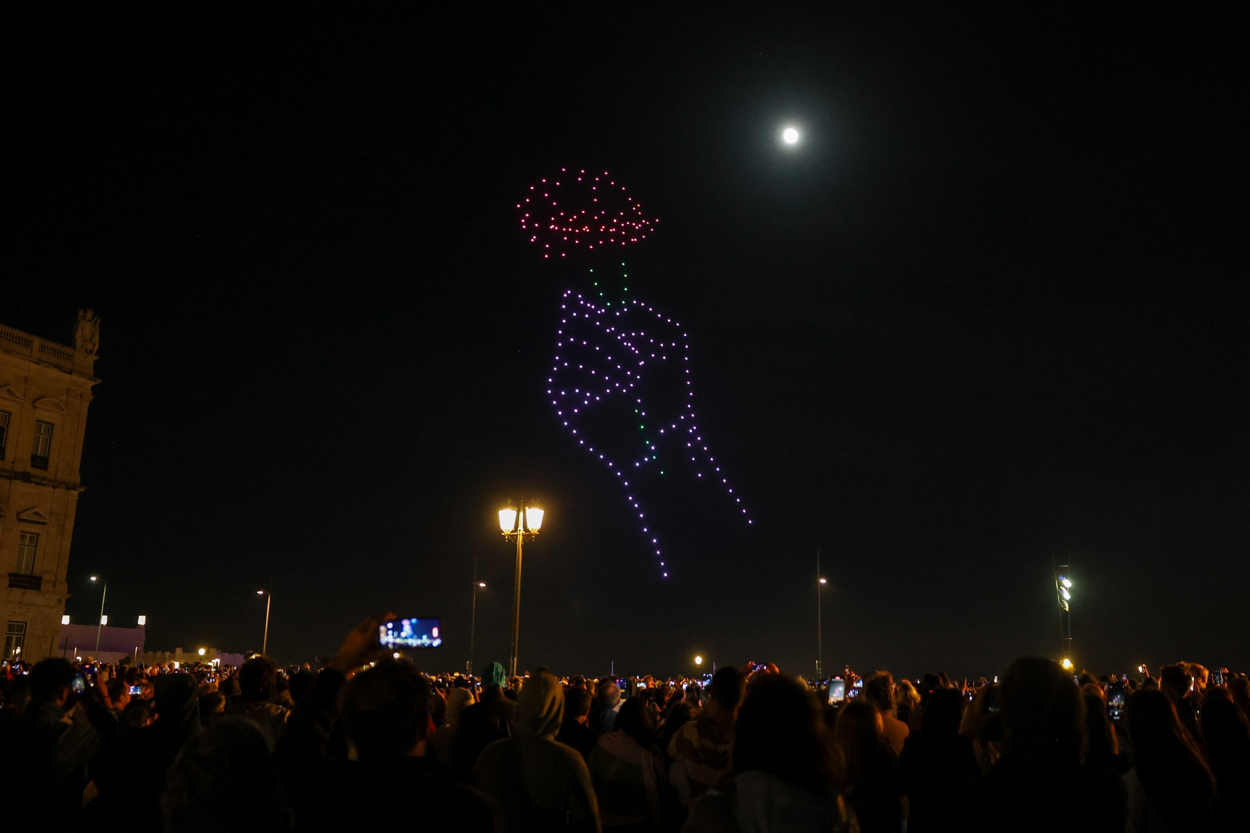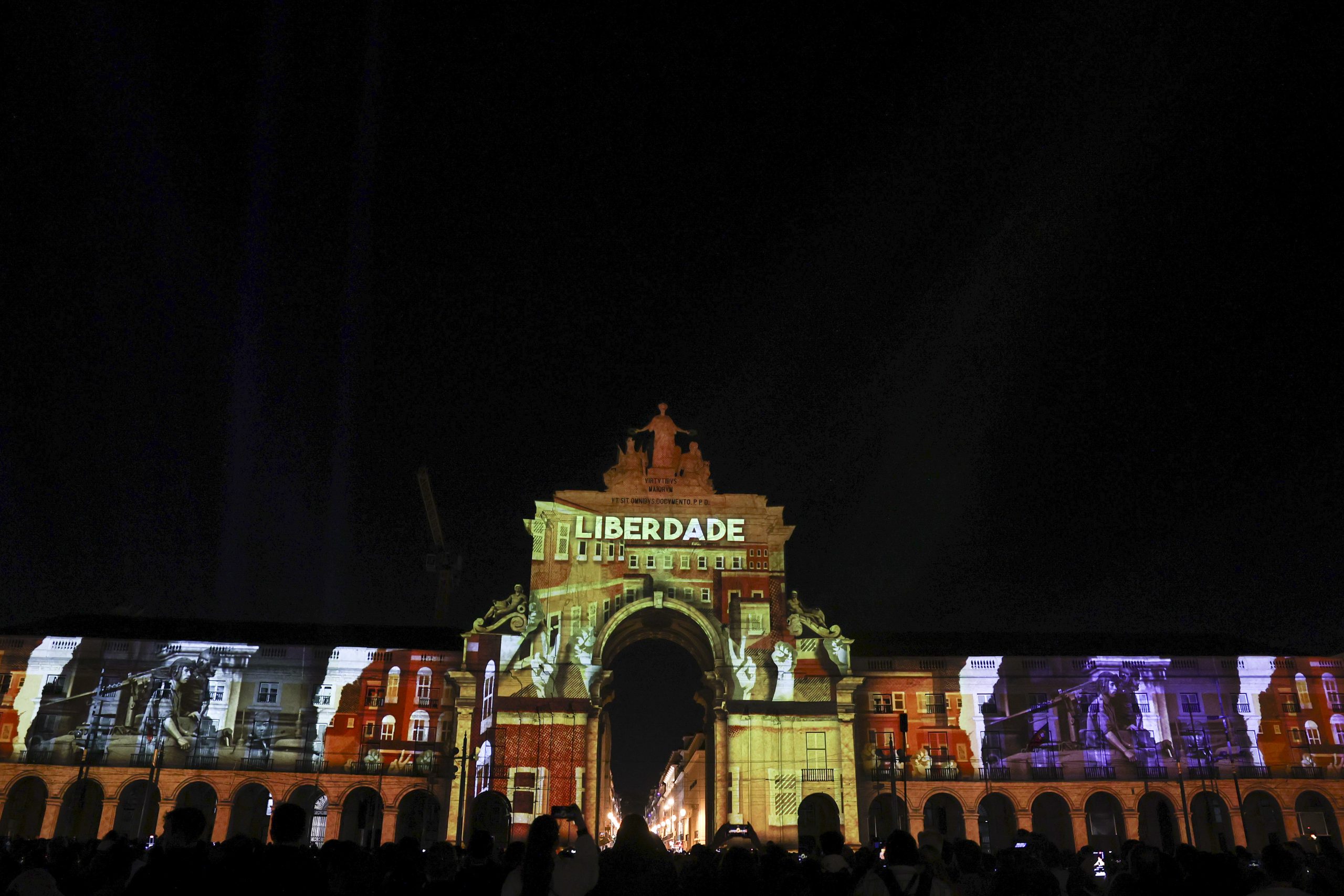 « Uma ideia de futuro » – concerto e projeção do Video Mapping « 25 de Abril, quinta-feira » promovido pela Câmara Municipal de Lisboa e produzida pela Empresa de Gestão de Equipamentos e Animação Cultural (EGEAC), no âmbito das Festas de Abril, na Praça do Comércio, em Lisboa, 24 de abril de 2024. – Videomapping composto por fotografias de Alfredo Cunha e música de Rodrigo Leão, numa parceria com a Comissão Comemorativa 50 anos do 25 de abril. MANUEL DE ALMEIDA/LUSAEspetáculo pirotécnico e drones .promovido pela Câmara Municipal de Lisboa e produzida pela Empresa de Gestão de Equipamentos e Animação Cultural (EGEAC), no âmbito das Festas de Abril, na Praça do Comércio, em Lisboa, 24 de abril de 2024. MANUEL DE ALMEIDA/LUSA