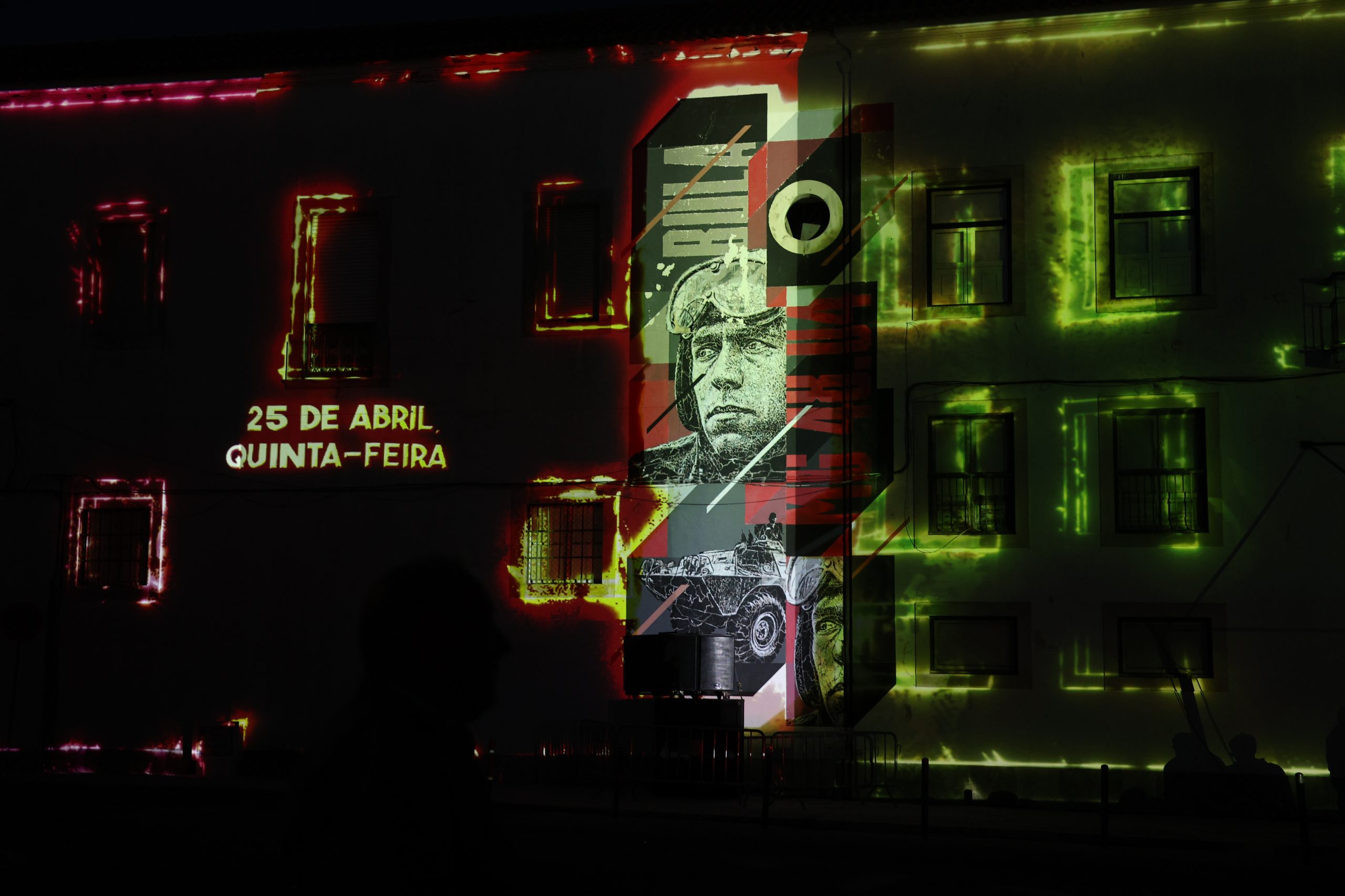 Espetáculo de projeção do Video Mapping « 25 de Abril, quinta-feira », na Escola Prática de Cavalaria, em Santarém, 24 de abril de 2024. TIAGO PETINGA/LUSA